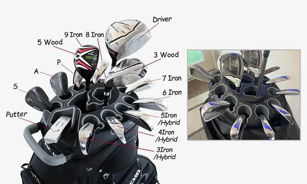It uses 14 individual slots with secure locking grooves that hold clubs firmly in place—even during cart movement or rough terrain.