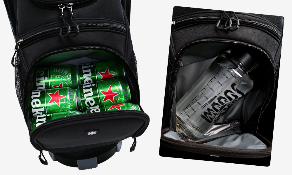 From reaching into the oversized insulated Ice Pocket for a cold drink, to safely storing your phone, watch, and valuables in the velvet-lined waterproof pocket, every detail is designed for effortless convenience on the course.