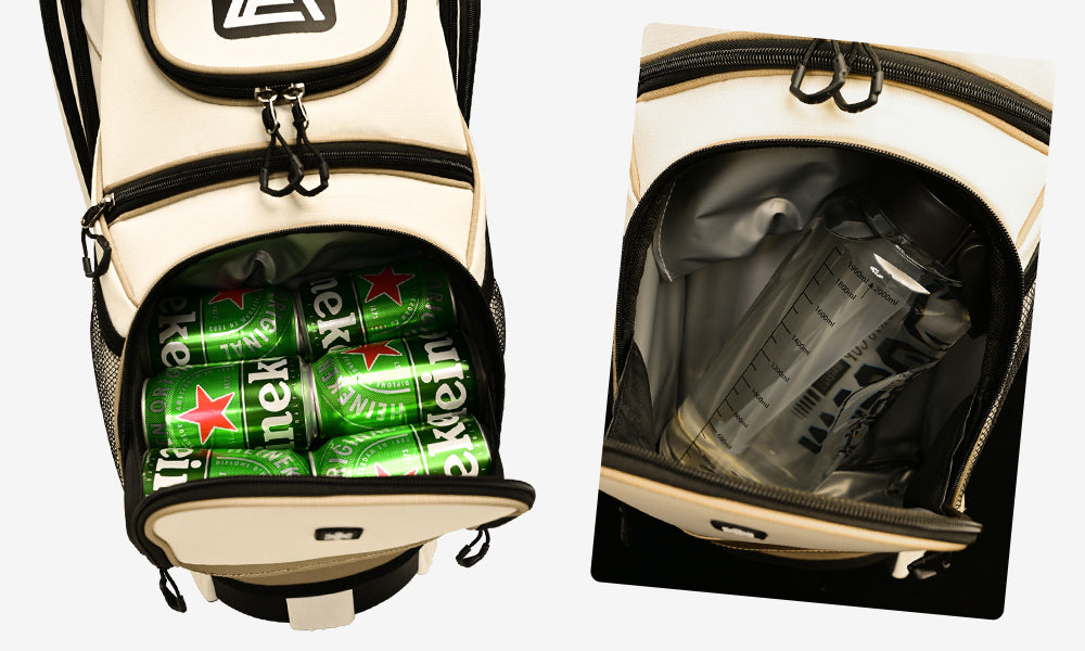 From reaching into the oversized insulated Ice Pocket for a cold drink, to safely storing your phone, watch, and valuables in the velvet-lined waterproof pocket, every detail is designed for effortless convenience on the course.