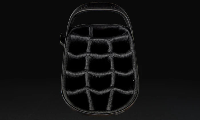 It uses 14 individual slots with secure locking grooves that hold clubs firmly in place—even during cart movement or rough terrain.