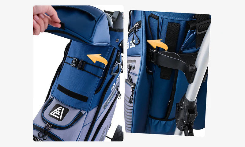 • With its innovative organizer top, keeps your clubs secure and soundless while you move around the course.