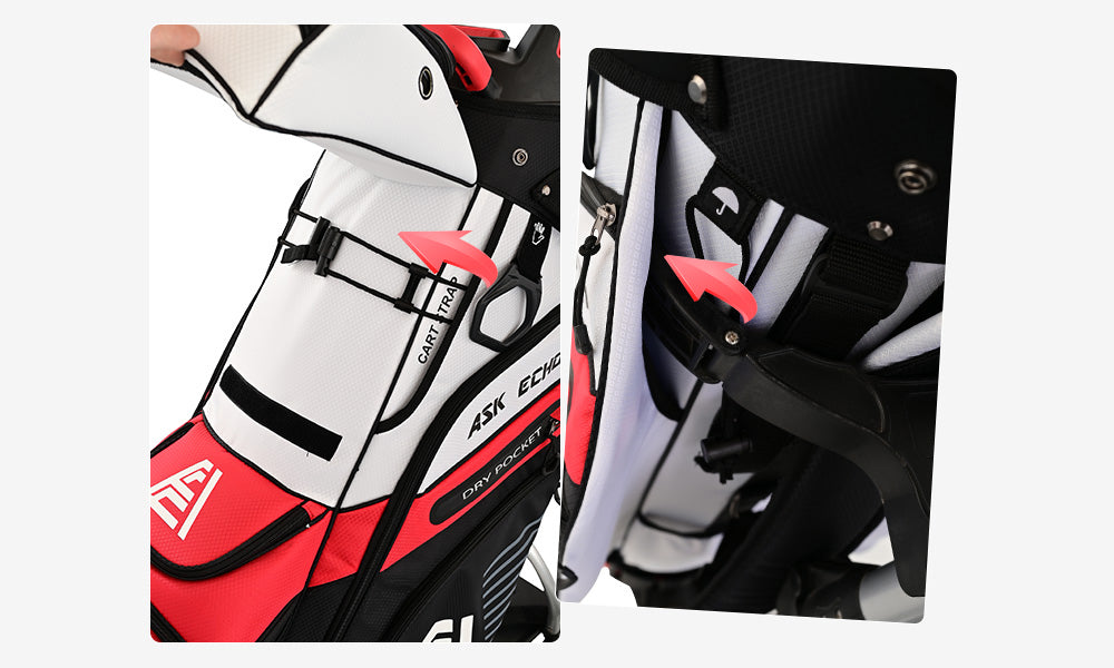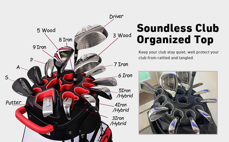 - With its innovative organizer top, keeps your clubs secure and soundless while you move around the course.