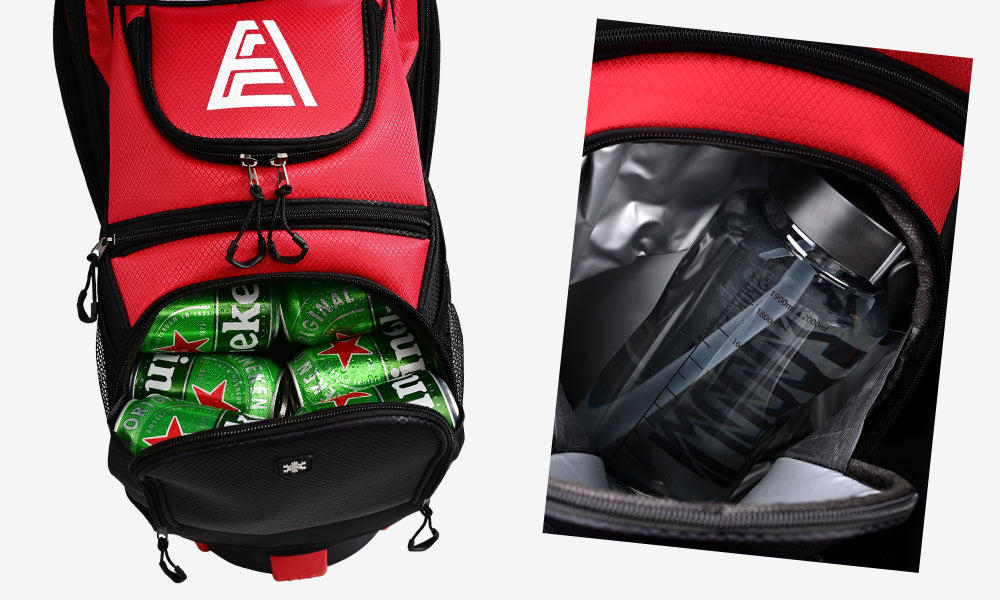 • Over-sized cooler pocket can hold 8-12 bottles of 12-oz cans or a water cup of 67 fl.oz.